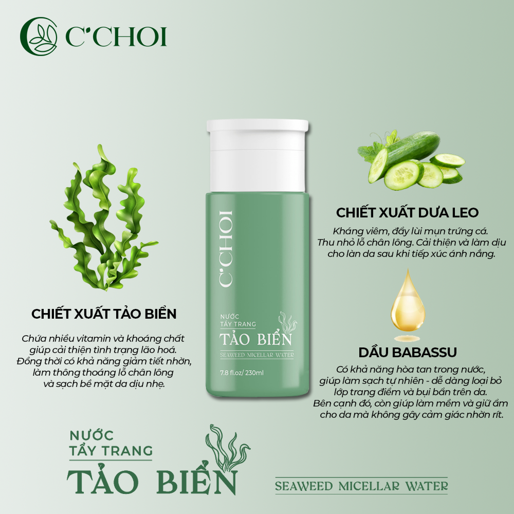 Nước Tẩy Trang Tảo Biển - Seaweed Micellar Water là bước đầu tiên thuộc bộ sản phẩm làm sạch của Mỹ phẩm xanh C'Choi, được khuyên dùng kèm với Sữa Rửa Mặt Bọt Khoáng.