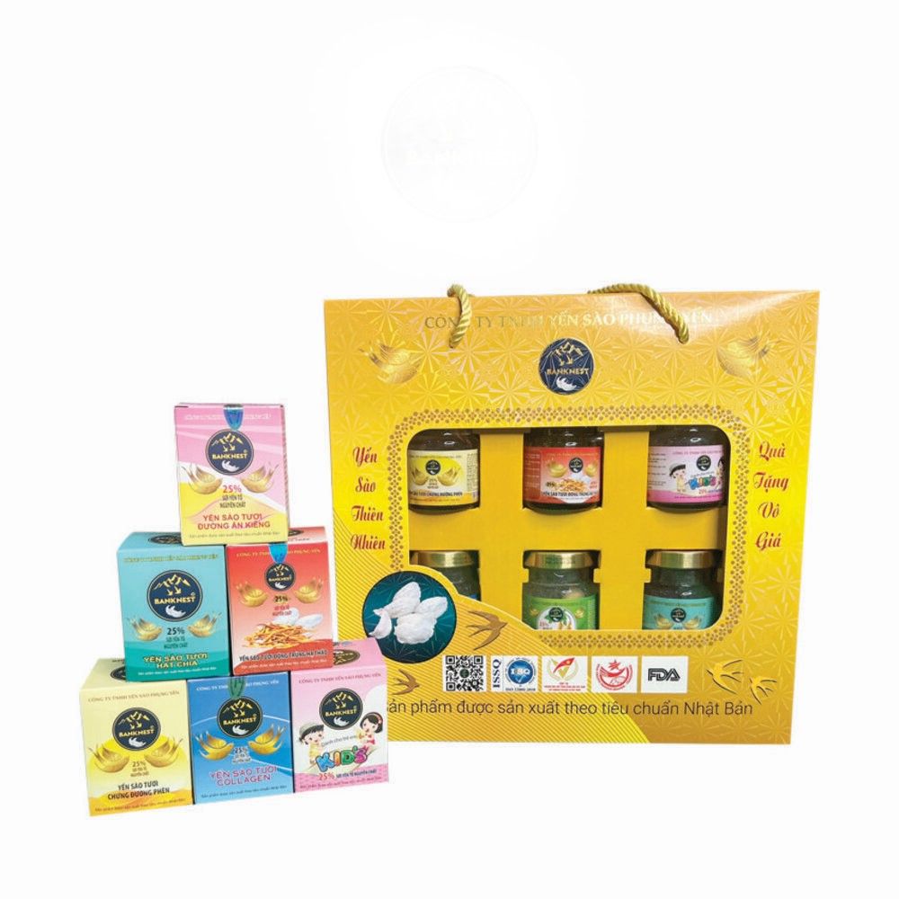 | 20. | Mô tả sản phẩm | Yến sào tươi 6 vị thập cẩm: Sâm, Đông Trùng Hạ Thảo, hạt chia, Collagen, Đường phèn, Đường ăn kiêng, với 25% sợi tổ yến nguyên chất là sản phẩm được rất nhiều anh chị em, cô chú ưa chuộng lựa chọn cho gia đình. Được chiết xuất từ 25% sợi yến tổ nguyên chất: - Không chất phụ gia, - Hương thơm ngọt phù hợp với khẩu vị nhiều người lớn và người già, - Bổ sung khoáng chất Mangan và Kẽm giúp tăng cường hệ tiêu hóa - Acid Amin Phenylalanine giúp tăng cường trí nhớ. |